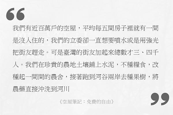 前不久和朋友聊到影響自己最深的一本書,我想也不想就推薦了"空屋筆記:免費的自由",也是我第一本希望可以傳閱給自己所有朋友的好書,而它的開頭就連續轟炸了許多大哉問。